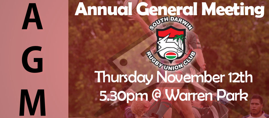 The South Darwin Rugby Union Club AGM will be held at 5:30pm on Thursday November the 12th at Warren Park.